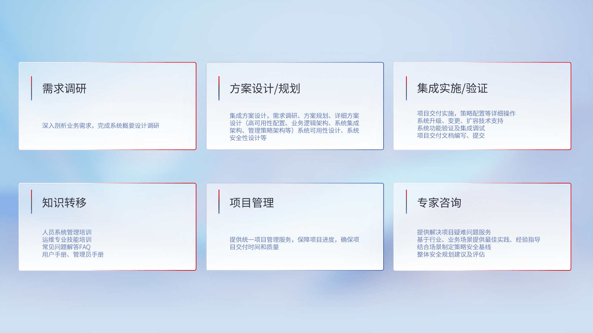 针对客户行业特性,,,将宏观的安全战略和需求,,通过专业的交付服务,,,实现项目落地,,为客户提供标准规范的集成交付服务。。